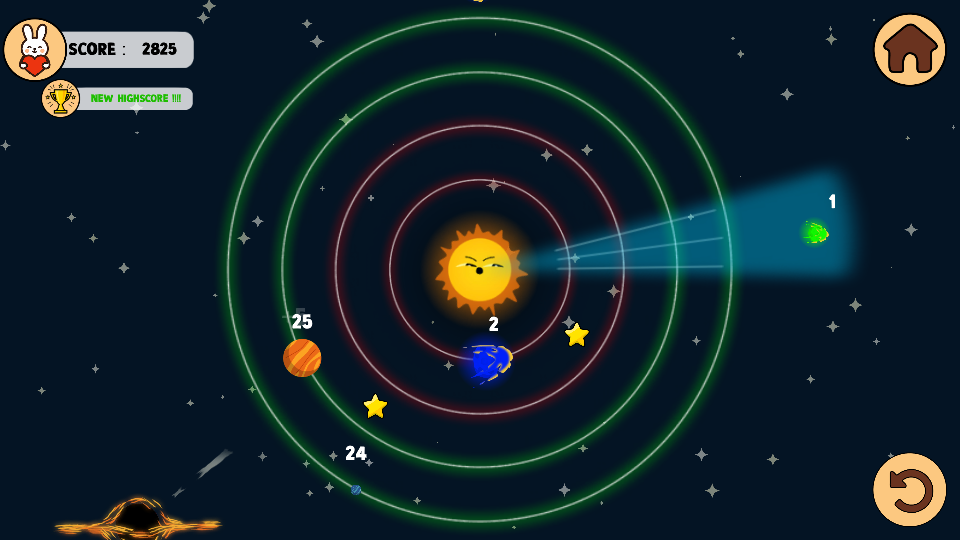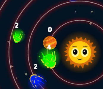 - Numbers above celestial objects show their remaining durability.